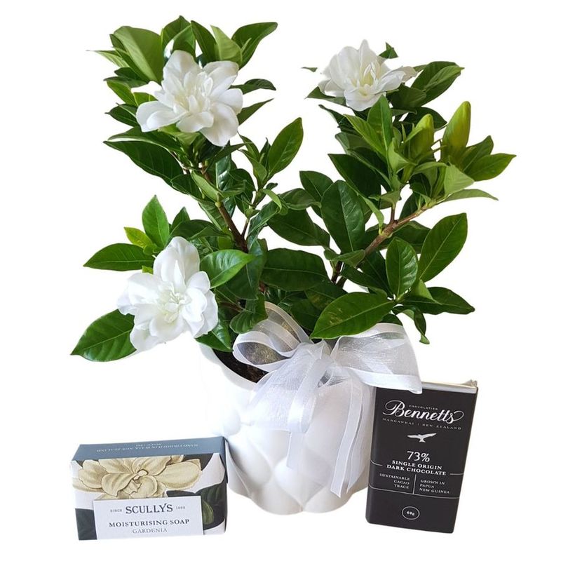 Your plant gift comes complete in a stylish ceramic pot with Scully's Gardenia Luxury Soap and a Bennett's Chocolate Bar to complete this simple yet elegant gift.