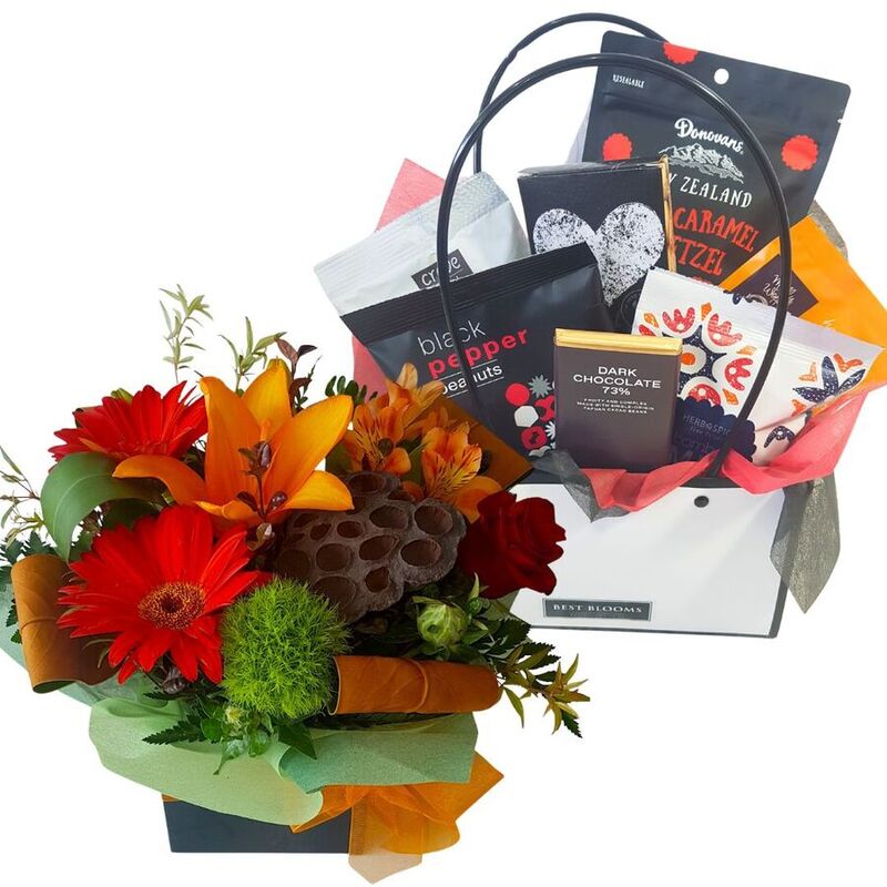 Add a beautifully co-ordinating arrangement of fresh flowers and save $20. Your flowers and gift basket will be packaged together in our Best Blooms signature box for a stylish, ready-to-deliver gift.