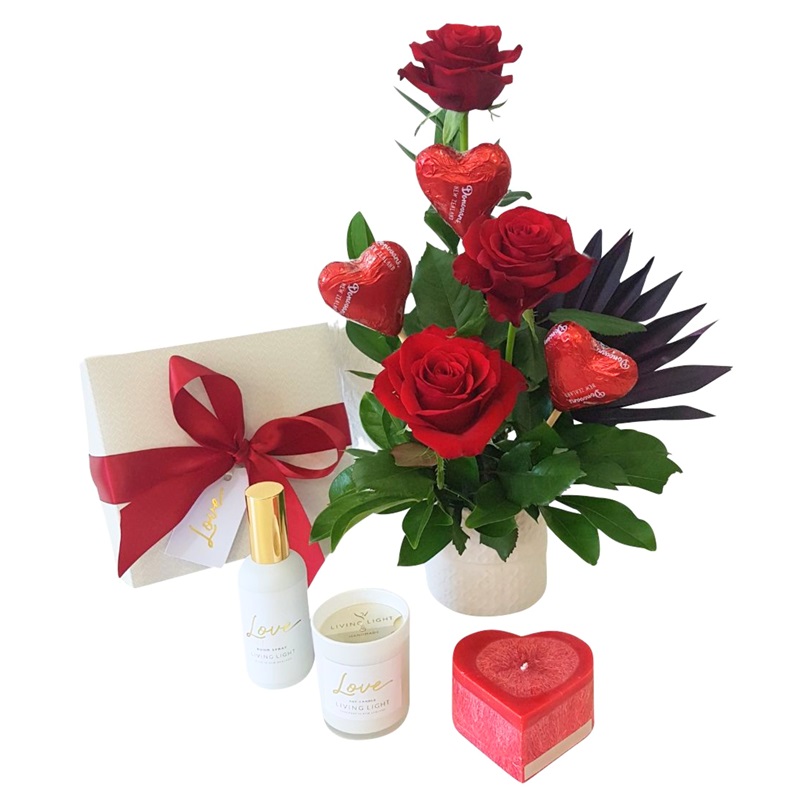This romantic gift set has the look and scent of LOVE. Includes a romantic red rose arrangement in a keepsake ceramic vase, ready to display on a table. With milk chocolate hearts, and a gift box of fragrant treats in the divine 'LOVE' scent of "juicy, plump berries laced with sandalwood and spicy white pepper - to celebrate the joy of love."