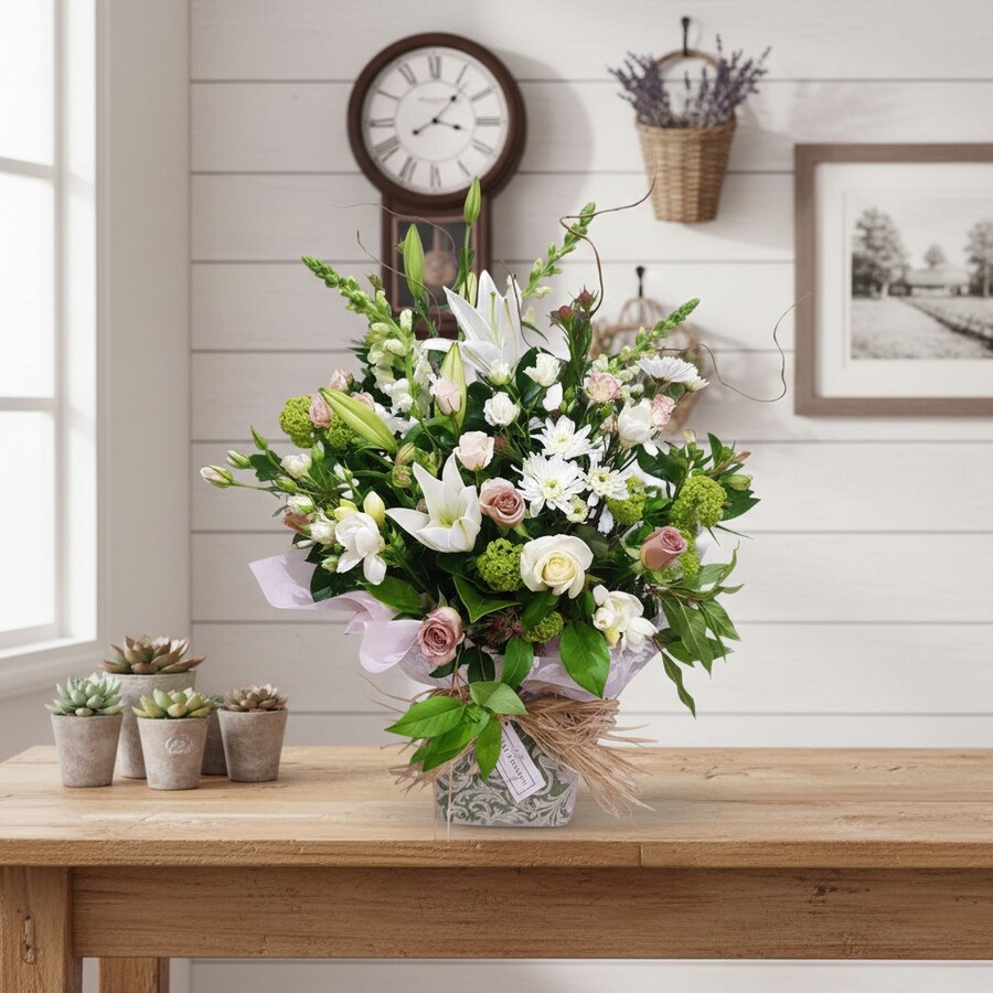 This tall, elegant bouquet is perfect for sympathy flowers, birthdays, anniversaries, welcoming a new baby or sending a heartfelt romantic gesture. Its natural styling makes it suitable for both thoughtful occasions and meaningful celebrations.
